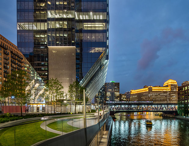 Sandwiched between railroad tracks and the Chicago River, a narrow strip of land offered proximity to one of Chicago’s busiest commuter train stations but was nevertheless long thought to be unbuildable. The site measures only 85 feet (26 m) at its widest, and the city required that at least 30 of those feet (9 m) be turned into a river promenade. Local developer Riverside Investment and Development acquired the land, along with air rights to two adjacent parcels, and worked with local architect Goettsch Partners and the local office of structural engineer Magnusson Klemencic Associates to construct a 54-story office tower while devoting more than 75 percent of the two-acre (0.8 ha) site to open space.