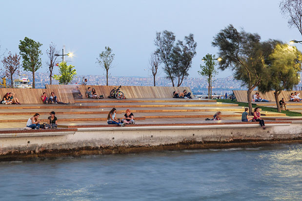 The Bostanlı Footbridge spans its namesake creek, closing one of the gaps in the coast’s promenade. With views of the city skyline and bay, the arched bridge allows small boats to pass beneath. To invite people to linger, the design team lined one side of the bridge with an angled platform of ash wood, thermally modified to enhance durability. Supported by a steel frame, the platform allows visitors to sit or sprawl. The companion piece, the Bostanlı Sunset Lounge, consists of tiered platforms of the same ash, providing more venues for taking in the sunset. The footbridge and lounge were completed in 2017.